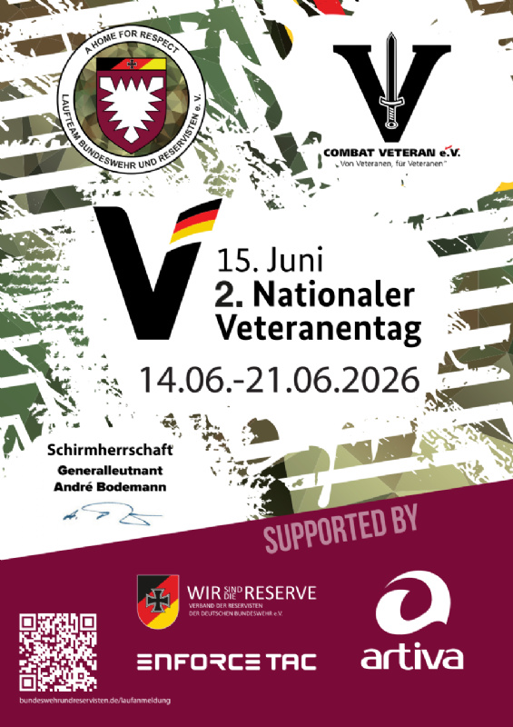 Im Rahmen des 2. Deutschen Veteranentages am 15. Juni 2026 führt das Laufteam Bundeswehr und Reservisten e.V. den 2. Veteranenlauf als virtuelle Veranstaltung im Zeitraum 14. Juni 2026 – 21. Juni 2026 durch. Als Schirmherren konnten wir Herrn Generalleutnant André Bodemann gewinnen. Die Spenden gehen diesmal zu 100% an den Combat Veteran e.V. Unterstützt werden wir wieder durch die EnforceTac.